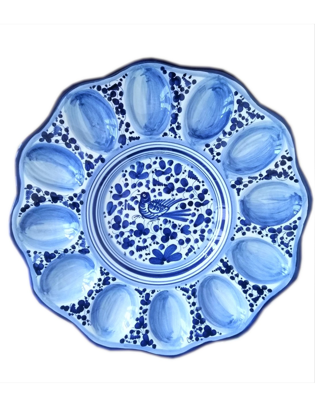 Ceramic egg plate with blue Arabesco pattern, handmade and handpainted in our factory in Deruta