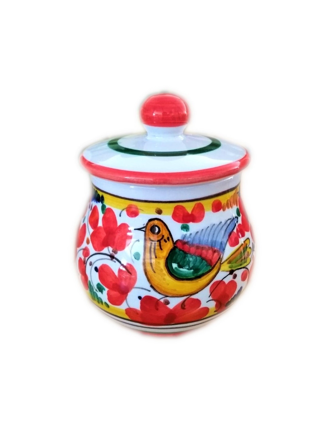 Ceramic sugar pot with red Arabesco pattern, handmade and handpainted in our factory in Deruta