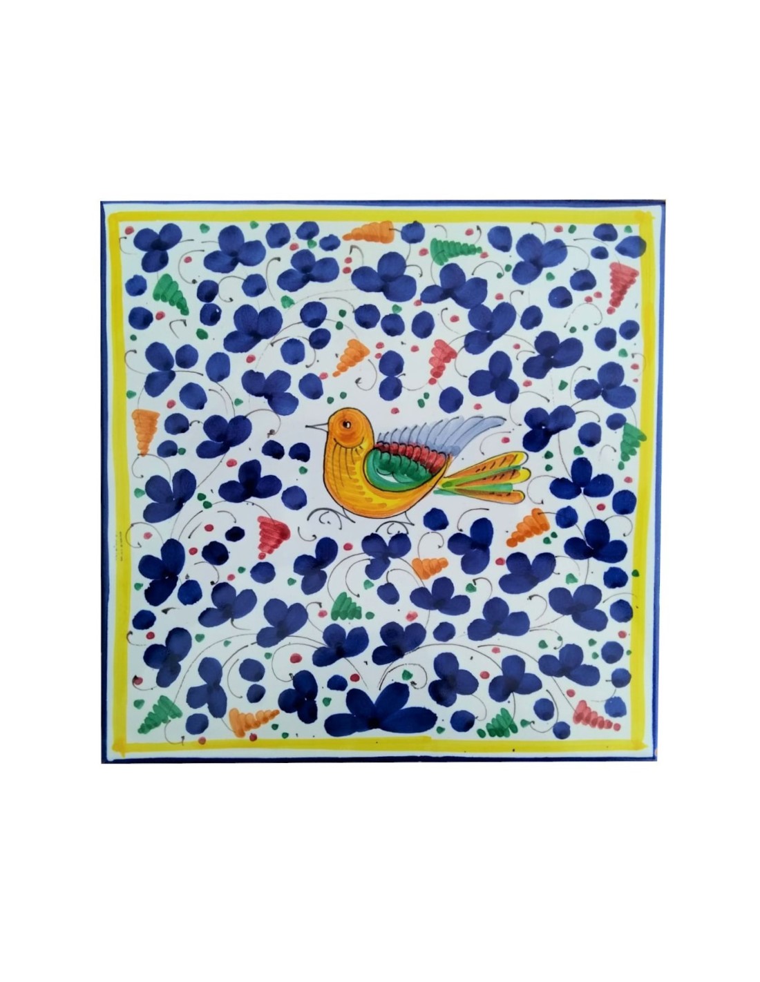 Ceramic tile with blue and yellow arabesco pattern, handmade and handpainted in our factory in Deruta