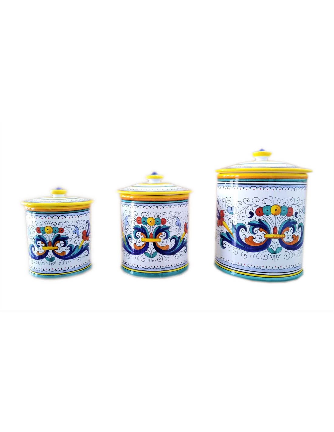Ceramic canisters with lid with Ricco Deruta pattern, hand made and hand painted in our factory in Deruta