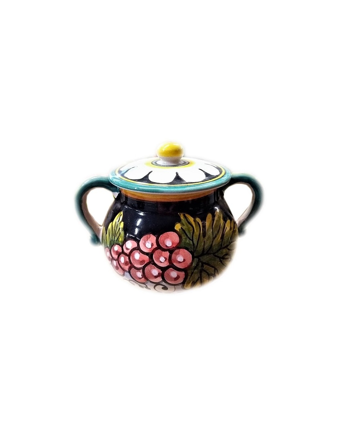 Ceramic sugar pot with Fruit black bottom pattern, handmade and handpainted in our factory in Deruta