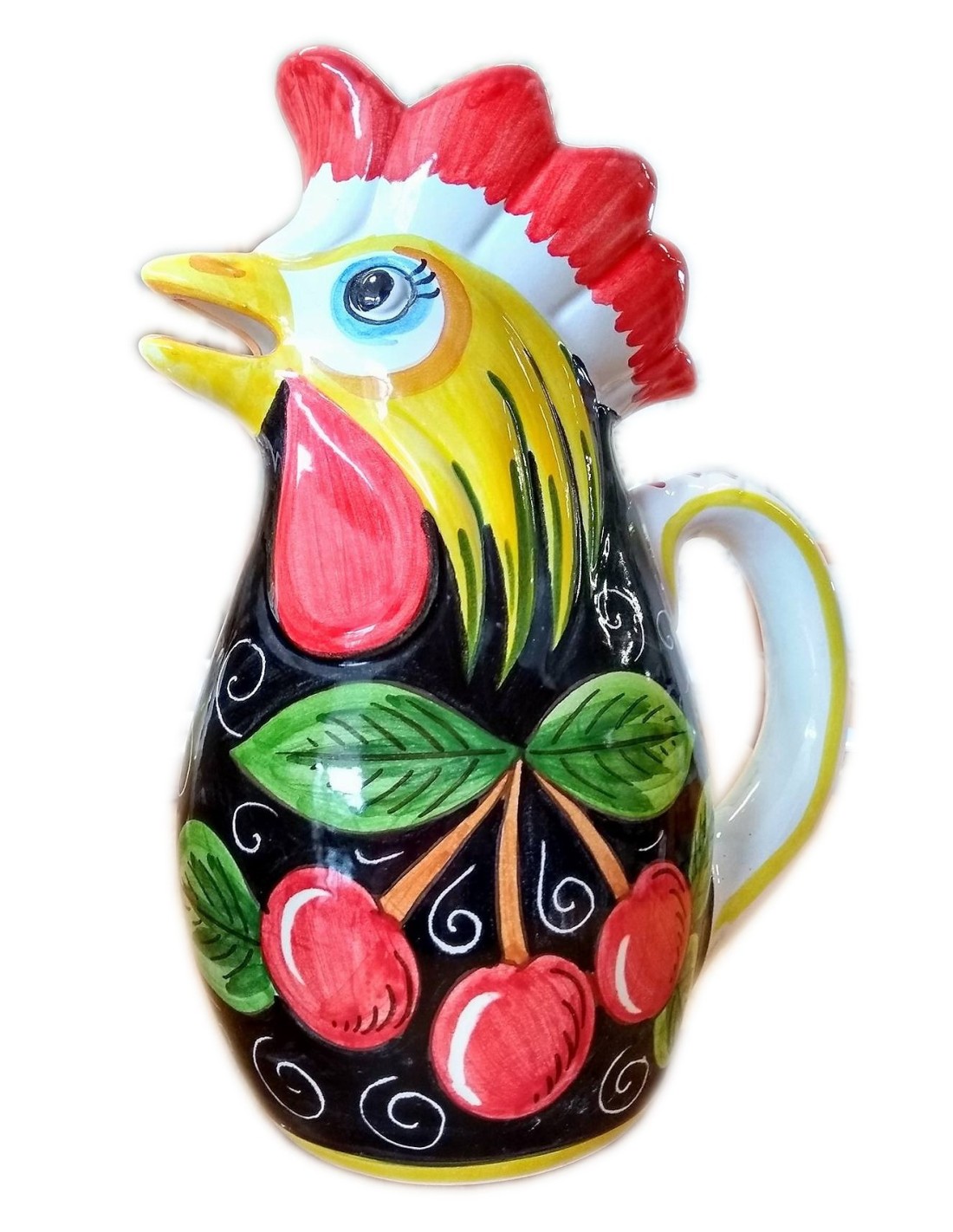 Ceramic rooster pitcher with Fruit black bottom pattern, handmade and handpainted in our factory in Deruta