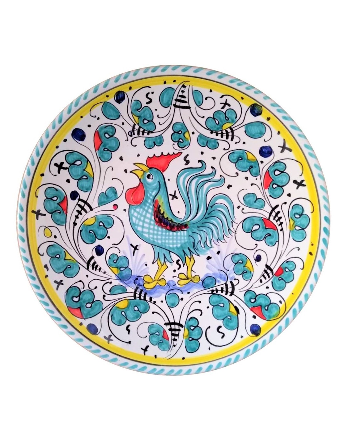 Ceramic decorative plate with green Rooster pattern, handmade and handpainted in our factory in Deruta