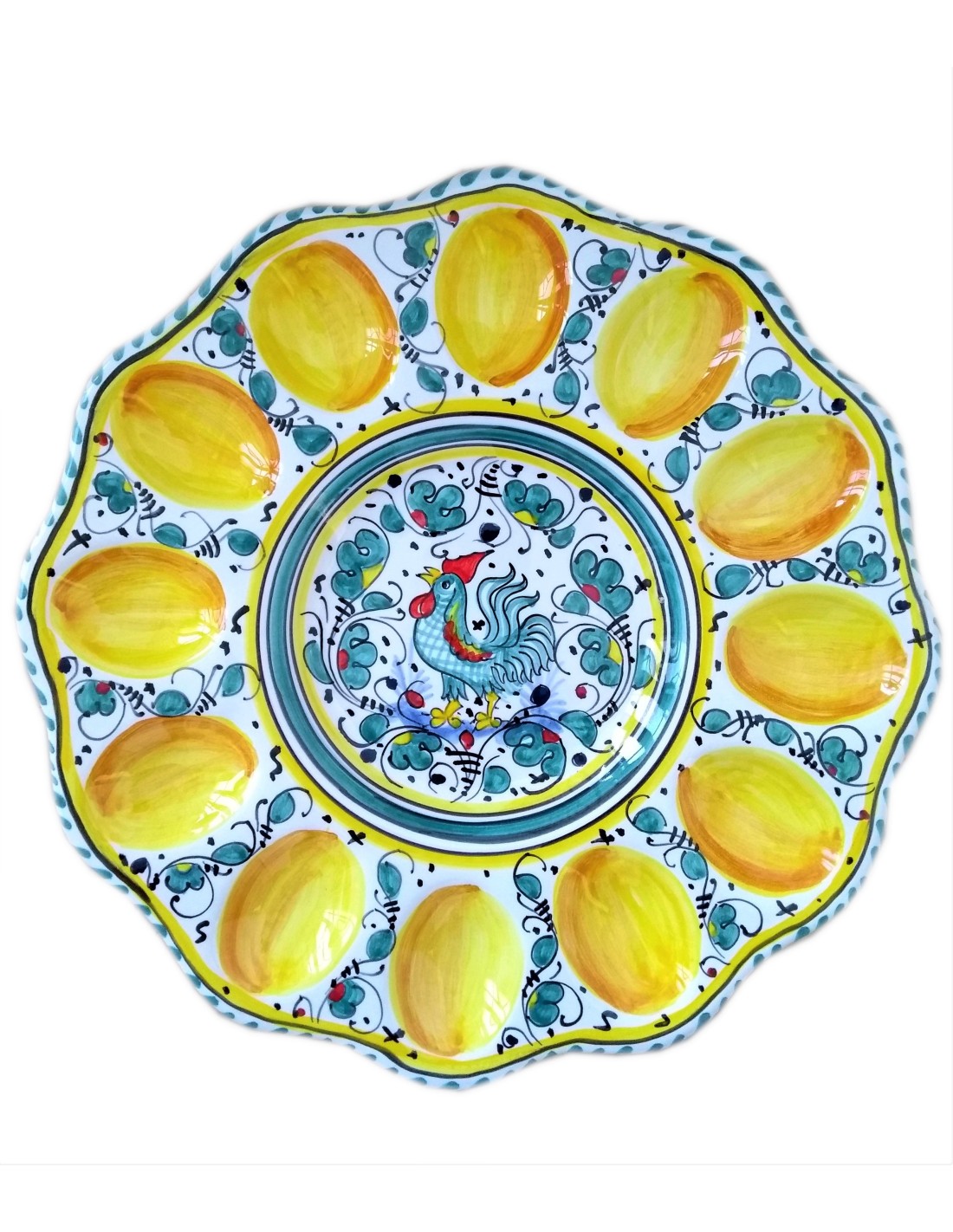 Ceramic egg plate with green Rooster pattern, handmade and handpainted in our factory in Deruta