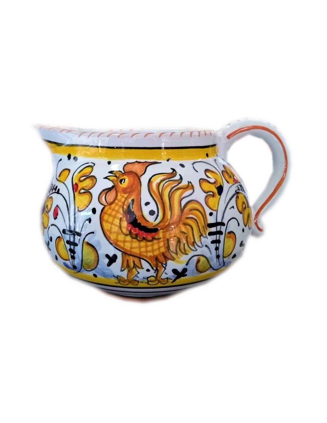 Ceramic creamer with yellow rooster pattern, handmade and handpainted in our factory in Deruta