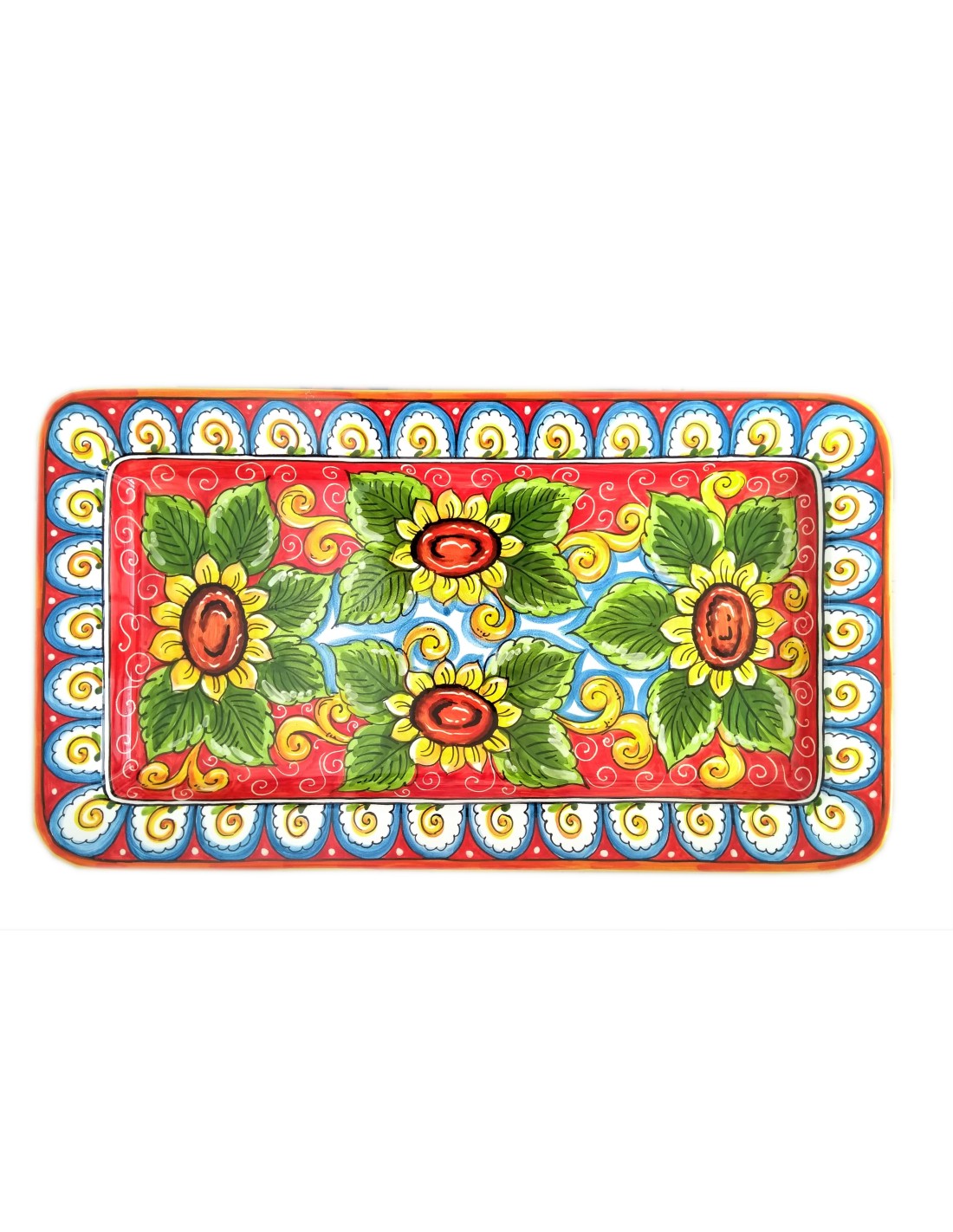 Ceramic rectangular tray with Sunflowers pattern, handmade and handpainted in our factory in Deruta
