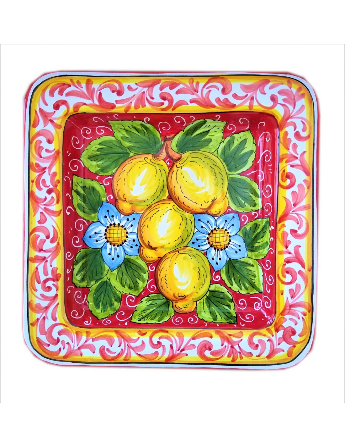 Ceramic decorative plate with red lemons pattern, handmade and handpainted in our factory in Deruta