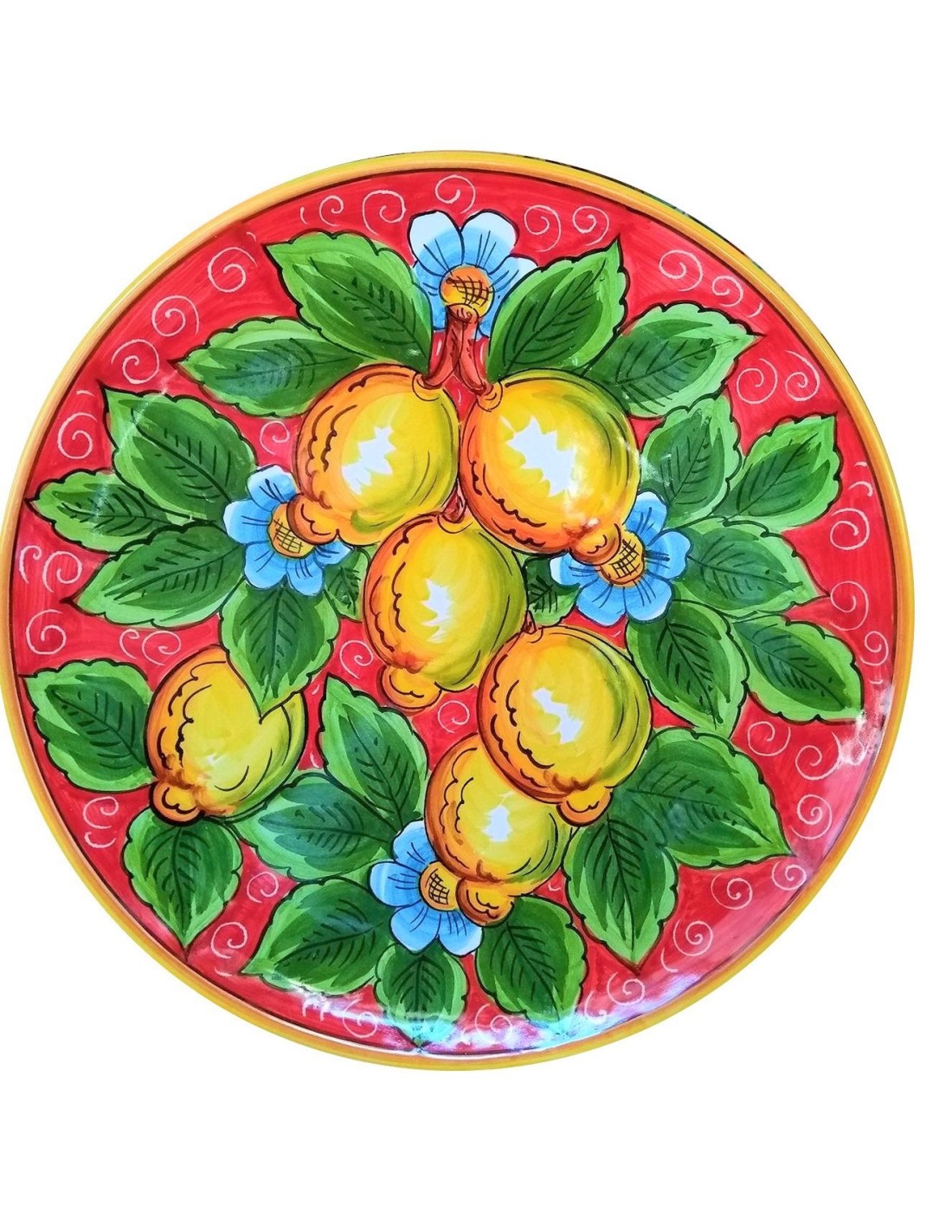 Ceramic decorative plate with red lemons pattern, handmade and handpainted in our factory in Deruta