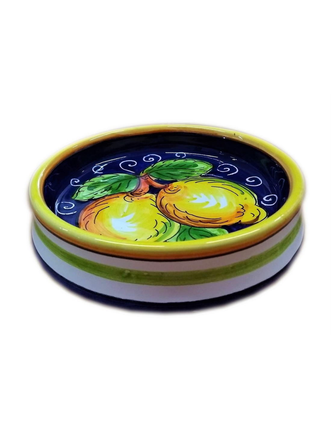 Ceramic wine coaster with blue lemons pattern, handmade and handpainted in our factory in Deruta