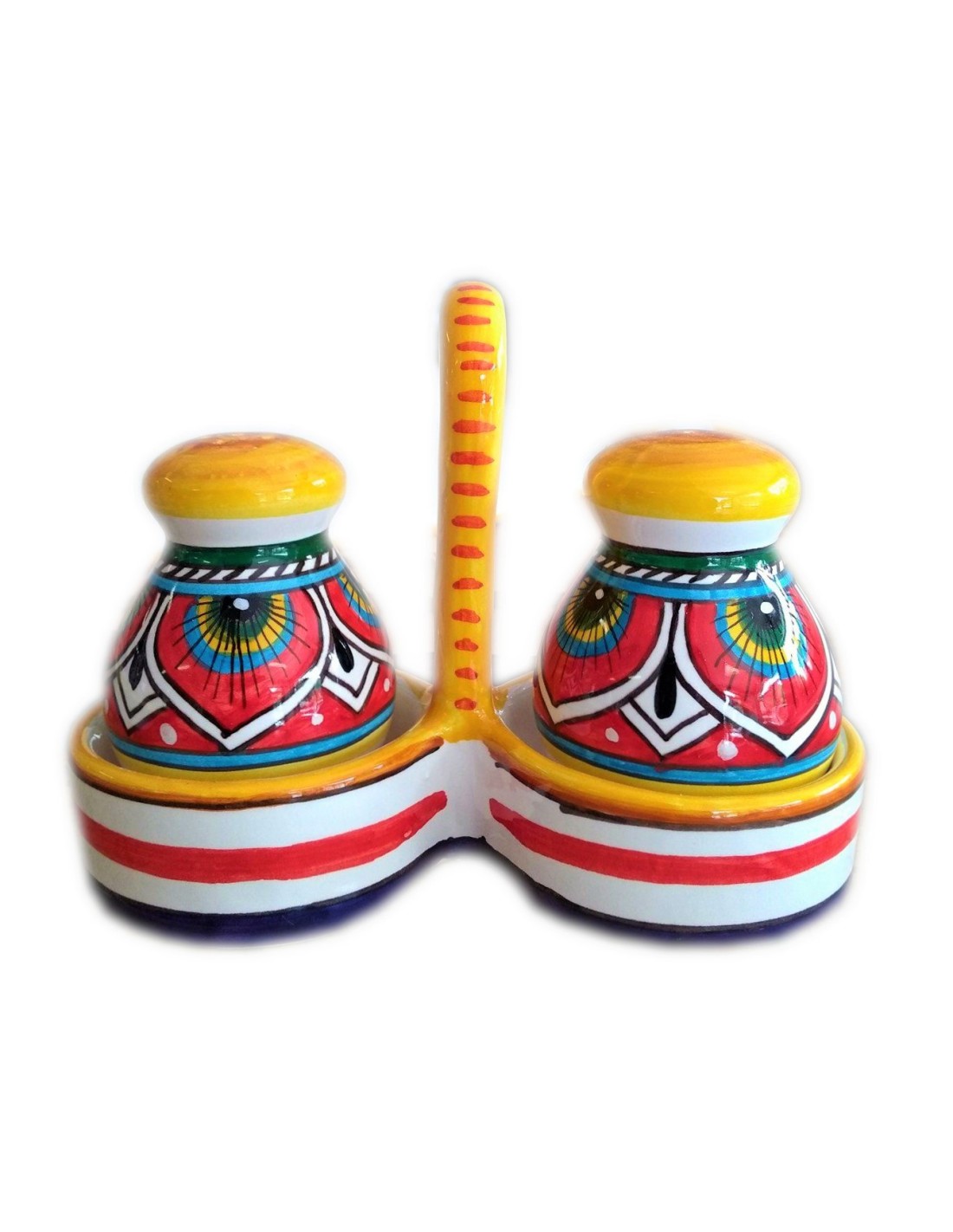 Ceramic salt and pepper set with red Peacock's feathers pattern, handmade and handpainted in our factory in Deruta