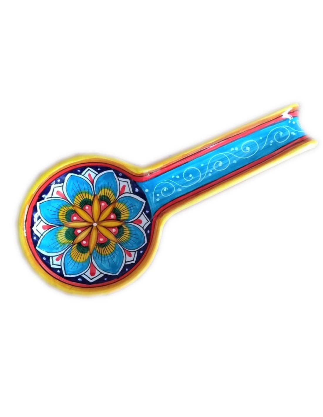 Ceramic spoon rest with light blue peacock's feathers pattern, handmade and handpainted in our factory in Deruta