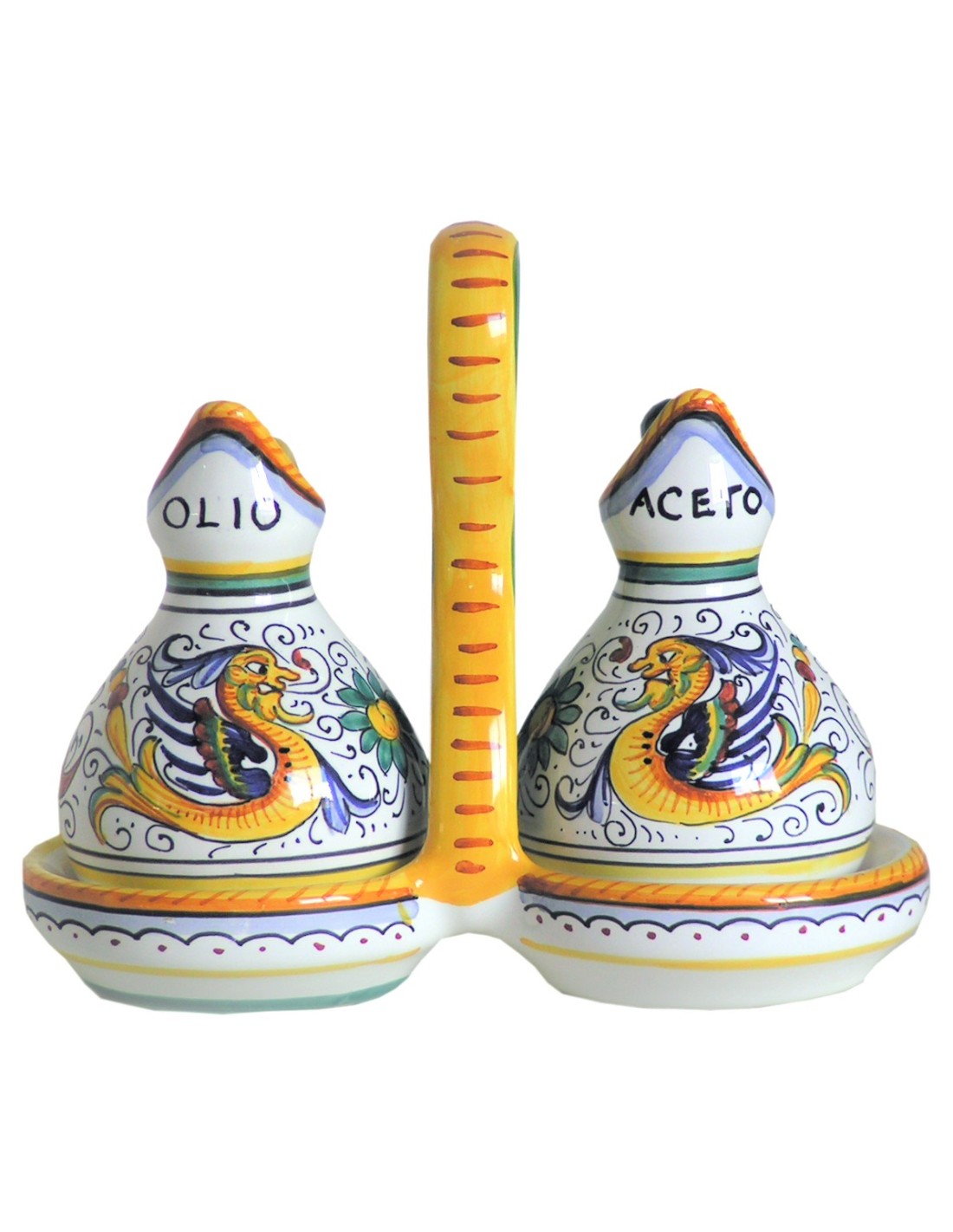 Ceramic oil and vinegar with basket with Raffaellesco pattern