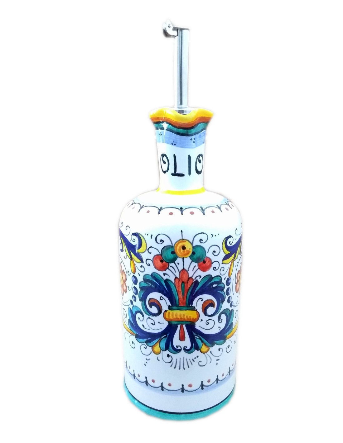 Ceramic oil bottle with Ricco Deruta pattern with metal top, handmade and handpainted in our factory in Deruta.
