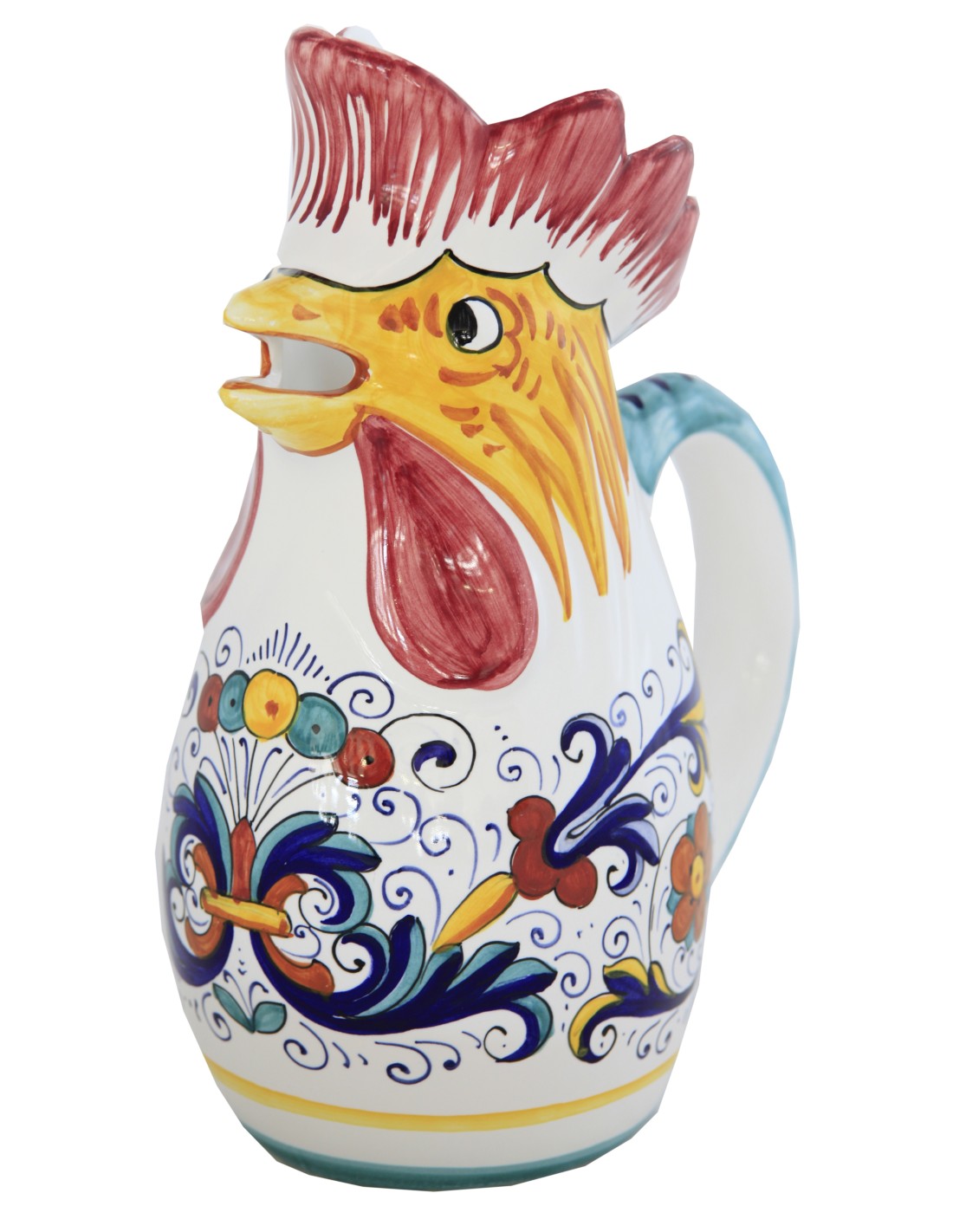 Ceramic rooster pitcher with Ricco Deruta pattern, handmade and handpainted in our factory in Deruta