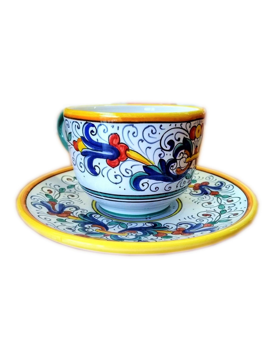 Ceramic cup and saucer with Ricco Deruta pattern, handmade and handpainted in our factory in Deruta