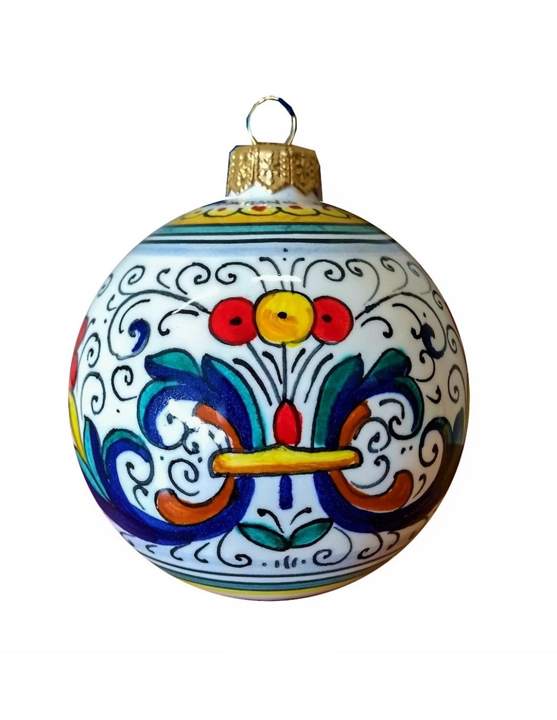 Ceramic Christmas balls with Ricco Deruta pattern, handmade and handpainted in our factory in Deruta