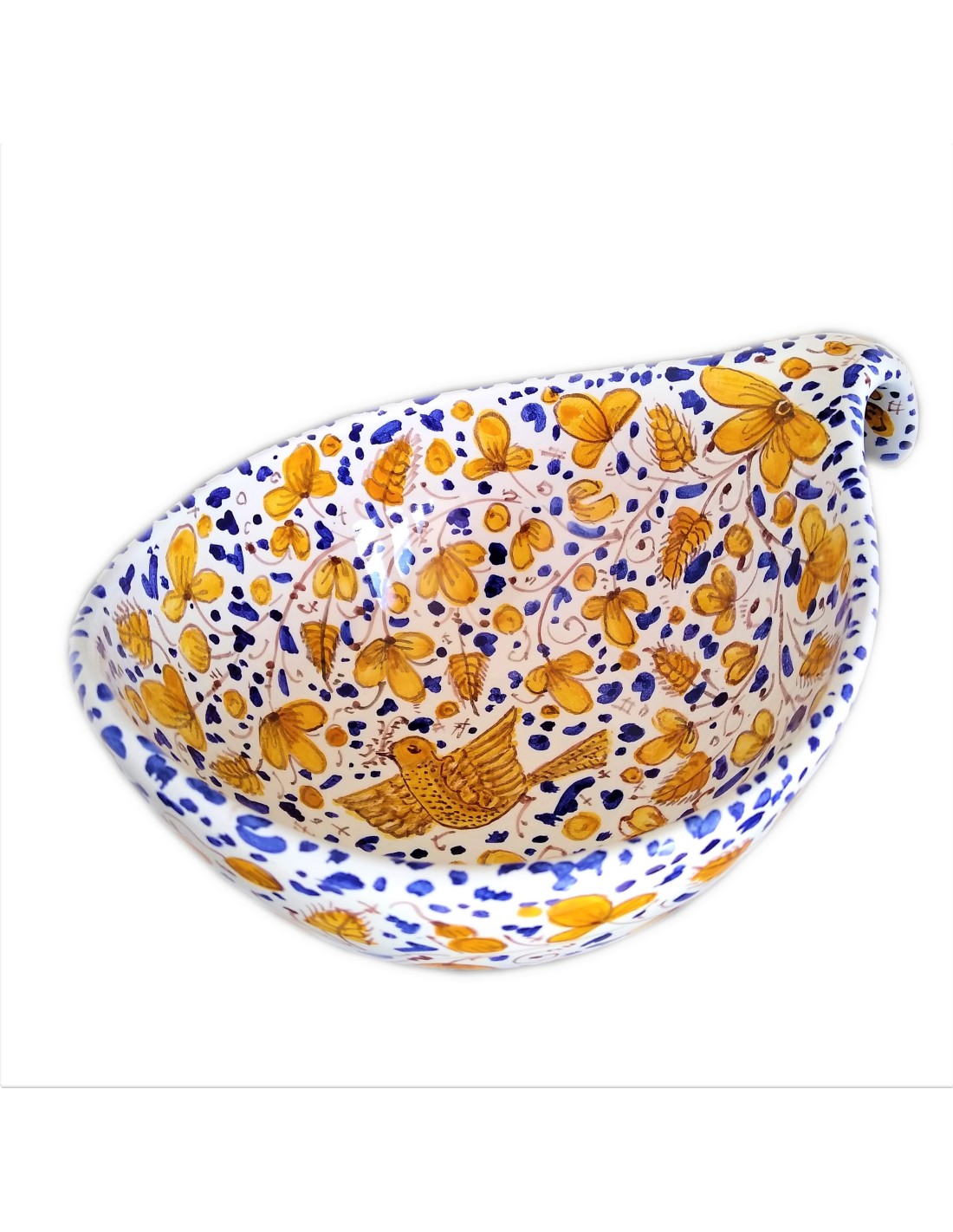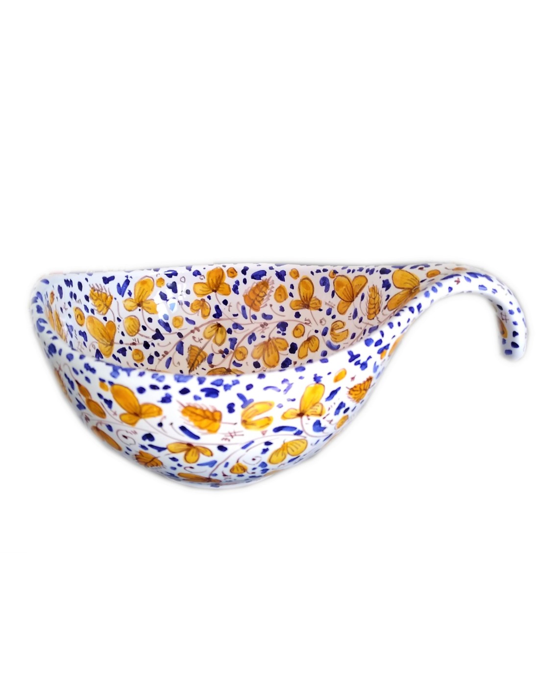 Ceramic gravy boat with yellow arabesco pattern, hand made and hand painted in our factory in Deruta.