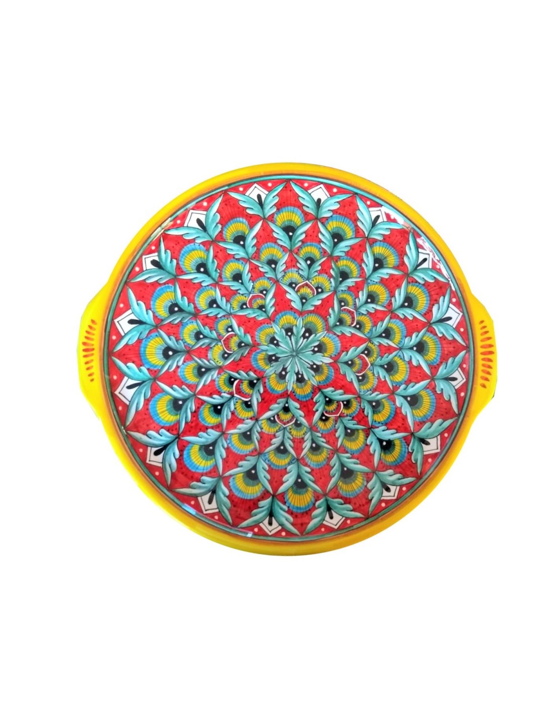 Ceramic round platter with red pavoncella pattern, handmade and handpainted in our factory in Deruta
