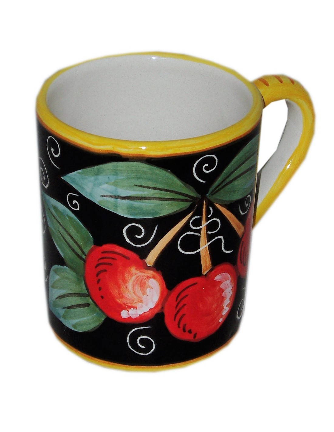 Bicchiere in ceramica con manico con decoro Frutta fondo nero, realizzato e dipinto a mano nella nostra fabbrica di Deruta