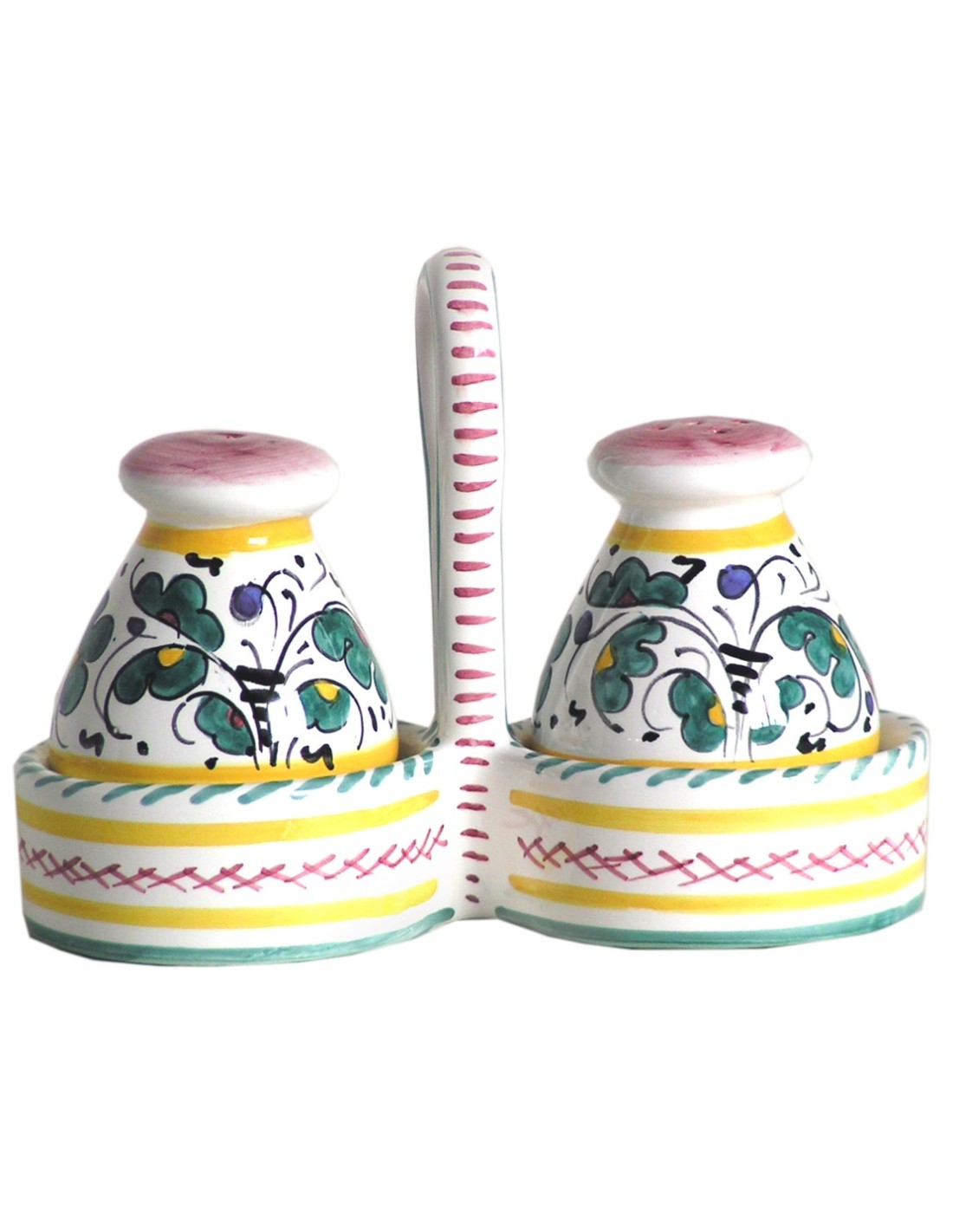 Sale e pepe con cestello in ceramica con decoro Gallo, realizzato e dipinto a mano nella nostra fabbrica di Deruta